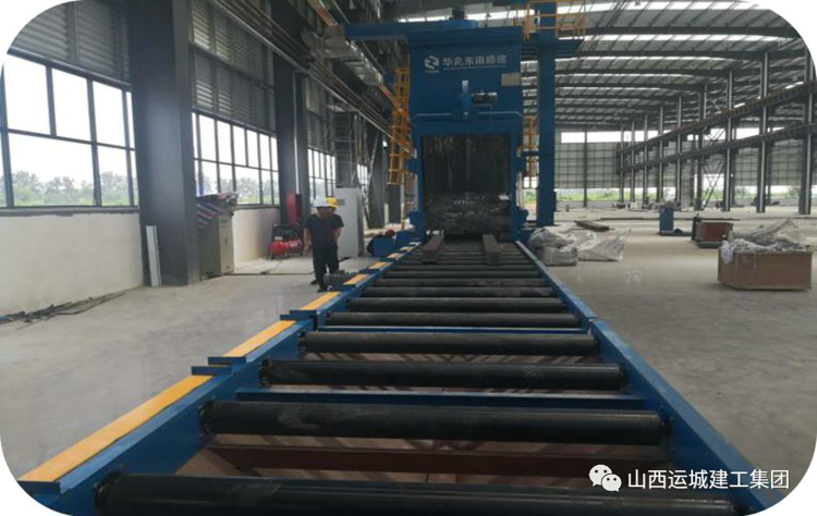 通過行車及地坪車運輸來已矯正好的H型鋼,吊放在傳送輥軸上送入拋丸機,由拋丸機噴射鉛丸對H型鋼進行全面除銹,除銹后H型鋼由行車吊裝至下一個生產工序---噴涂。